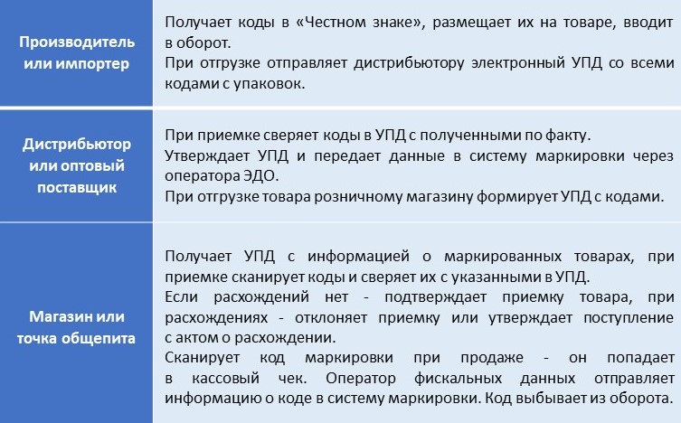 Кладовщики должны сканировать коды товаров, чтобы внести информацию о них в документы, операторы должны заказывать коды и вводить их в оборот, а бухгалтеры - направлять универсальные передаточные документы (УПД) контрагентам.